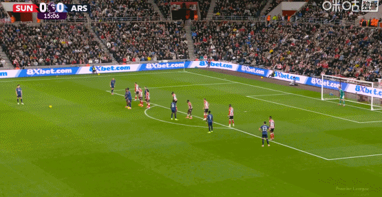 第15分钟,加布里埃尔造定位球,赖斯操刀兜射被扑