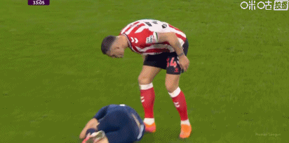 第34分钟,扎卡被判犯规,随后欲找倒地的梅里诺理论