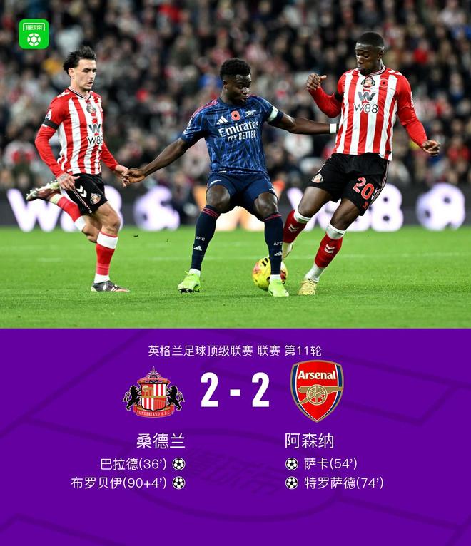 北京时间11月9日1:30,英超第11轮继续进行,阿森纳作客光明球场挑战桑德兰,本场主裁判为克雷格-鲍森。上半场,穆杰莱助攻巴拉德破门。下半场,梅里诺助攻萨卡扳平比分,特罗萨德世界波助阿森纳反超;补时阶段,布罗贝伊高难度凌空破门绝平。最终,阿森纳客场2-2战平桑德兰,各项赛事十连胜遭终结。