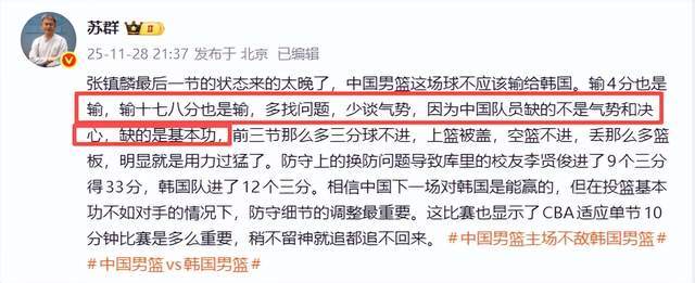 不过,作为名嘴,苏群给出的原因,可以说,他真的是很不客气了。苏群认为,中国男篮输在“基本功”——因为中国队员缺的不是气势和决心,缺的是基本功。