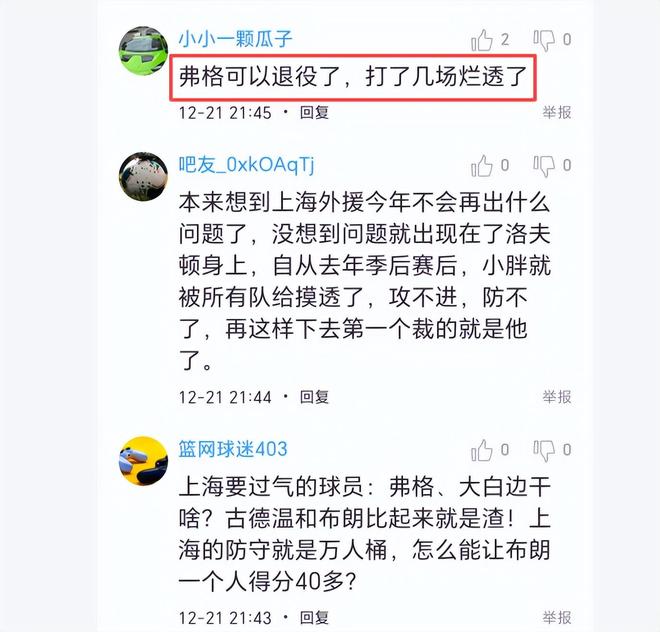 球迷也吐槽弗格,“上海签小王多好,弗格这两年都明显下滑严重了”、“上海缺的是控卫,像弗格这种锋卫在CBA已经无法立足了,这赛季跟FIFA接轨,比赛时间缩短,小外援在场上比重更大,不能控场是不行的,更重要的是,弗格迟迟找不到得分手感”、“弗格可以退役了,打了几场烂透了”。卢伟以为捡到宝,原来弗格是一坨......不知卢伟签弗格后悔了没有?这事,大家怎么看?