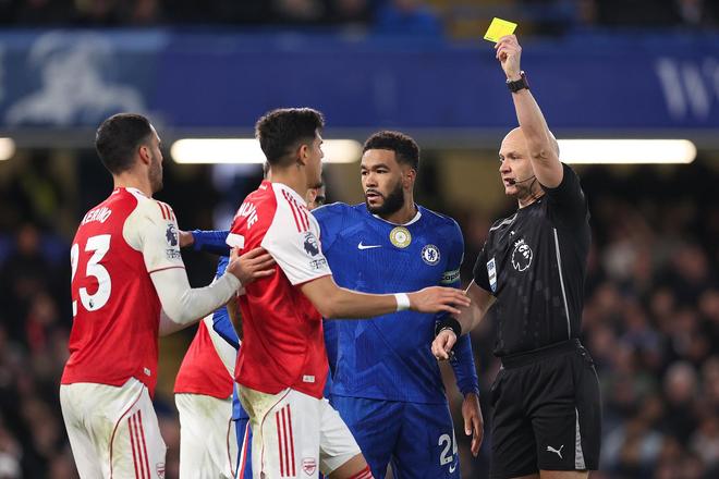 在这场关乎谁才是“伦敦之王”的较量中,两支传统强队没有发挥出各自最高的技战术水平,比赛充斥着肘击、挥拳、蹬踏和推搡。第38分钟,切尔西铁腰凯塞多蹬踏客串中锋的阿森纳中场梅里诺,经过视频助理裁判(VAR)审核,名哨安东尼·泰勒直接把凯塞多红牌罚下。阿森纳球员的动作也很粗野,包括约克雷斯在内的六名球员吃到黄牌。
